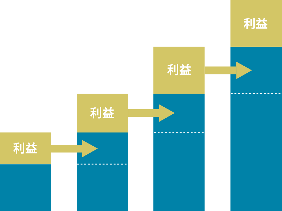 「元金と元金から得た利益を合計した額」に対し、さらに利息がついていくことを複利と言います。
