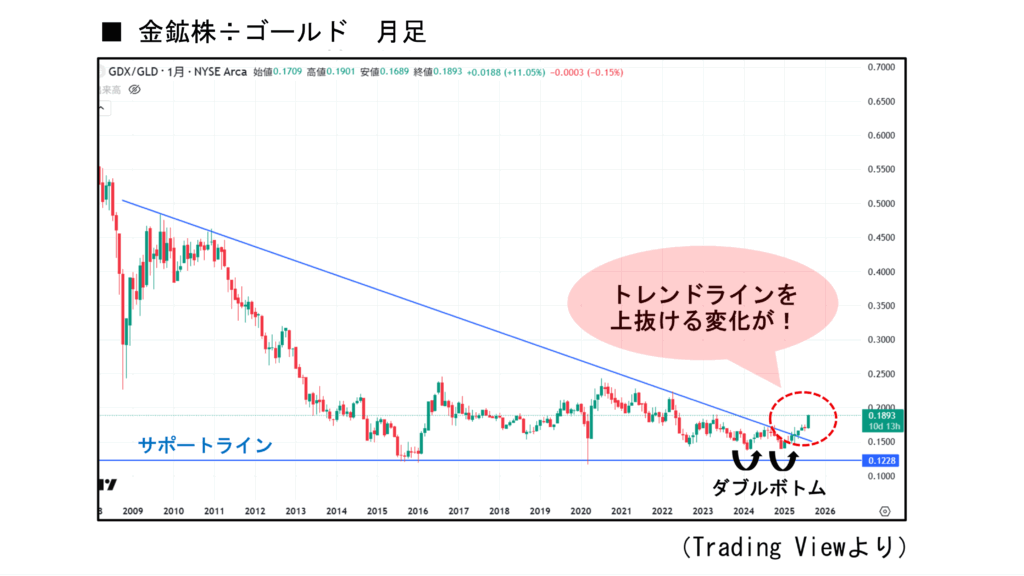「金鉱株ETF(GDX)÷ゴールド」チャートでは、2009年以降長期に亘ってアンダーパフォームしてきましたが、ここ数か月で そのトレンドラインを上抜けるなどの変化が見られます。