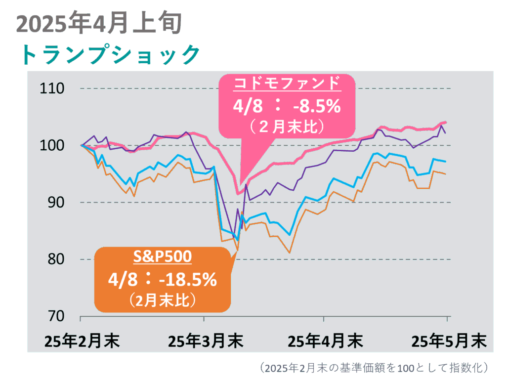 このファンドの実績を見ると、まだ記憶に新しい、トランプショック(2025年4月8日)時にS&P500が▲18.5%だったのに対して、コドモファンドは▲8.5%のマイナスにとどまっており、その後の回復基調も、2025年2月末を基準とした場合、S&P500を上回っています。