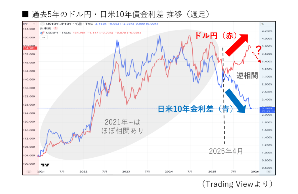 いずれまた相関関係に戻ると思われますが、現在のドル円の位置では日米金利差が約3.7%(現在2.16%)、また日米金利差の位置はドル円が約126円台(現在155円)にあります。
