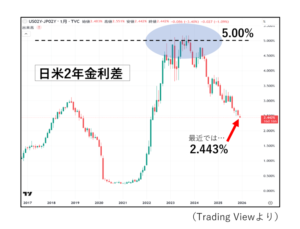 一時は5%以上あった金利差も、最近では約2.4%まで差が縮まっています。