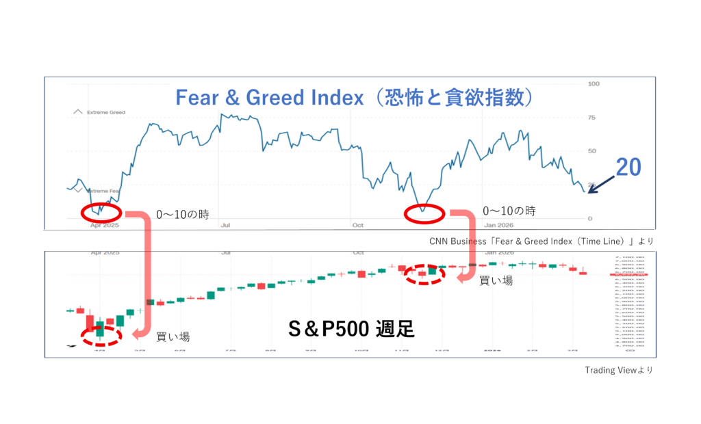 過去1年の動きを、上の「Fear & Greed Index」と下のS&P500のチャートを見比べてみてください。赤丸で示したように、指数が0〜10とかなり低い水準まで下がった場面では、同じ時期にS&P500が底打ち後上昇に転じており、「買い場」となっていることがわかります。
