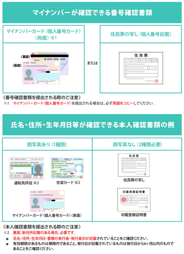 「マイナンバー(個人番号)が確認できる番号確認書類」および「氏名・住所・生年月日等が確認ができる本人確認書類」の両方が必要になります(下記参照)。